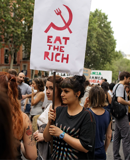 A young Communist holds a “Eat the Rich” sign in Madrid, Spain. Photo, Wikipedia.
